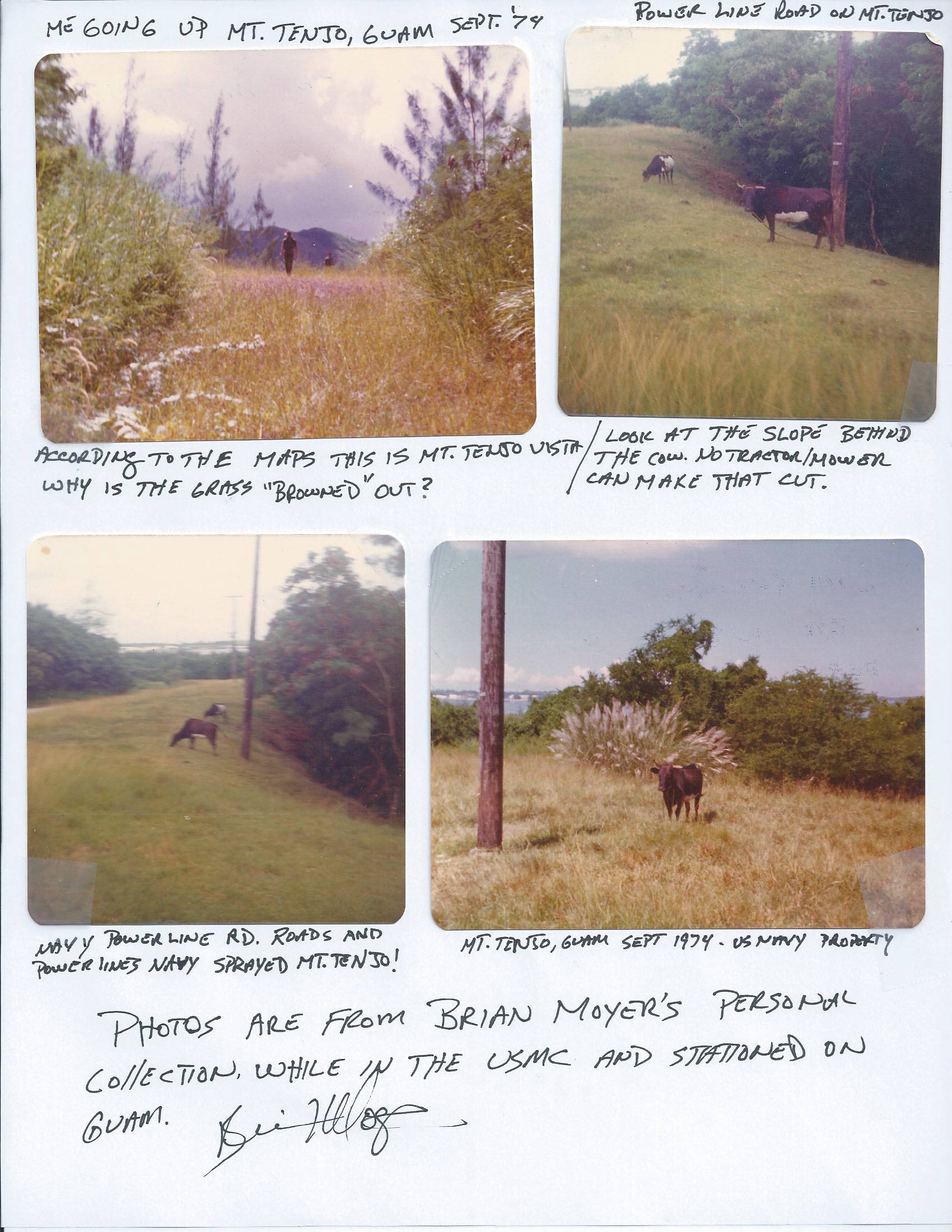 We would make our descent from Mt Tenjo down through more elephant/saw grass and upon breaking through the grass we found the "Pipeline Road" which was two above ground steel pipe lines that were running in what we thought was a north to south direction we climbed over the pipelines and they were oily and you could smell a fuel oil/diesel fuel odor about the whole area on many of our trips up to Mt Tenjo. That area had been sprayed by the late M/Sgt Leroy Foster who I would get to know on a very personal level through multiple visits to his home here in Florida and phone calls. Also on a couple of occasions there was a "white powder" like chalk dust or flour that would go airborne as we broke through the reeds and saw grass Leroy Foster informed me that he sprayed Agent Orange and Silvex along the "Pipeline Road" during his ten years of duty on Guam as a "vegetation control" worker on top of his other duties as a POL petroleum, oil and lubricants" technician.